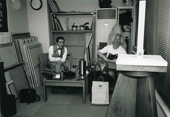 虎ノ門にあった執行の会社の中のアトリエにて 戸嶋靖昌(右)、執行草舟(左) 2004年当時戸嶋はまだグラナダから帰って来たばかりで、日本には家しかなくて、奥さんが長い闘病の末にガンで亡くなられて、ずっと家に引きこもっているような時期だったので、アトリエもない。特別なアトリエも持っていないので、それも用意してくれということを言われて、その当時僕が経営している会社が港区虎ノ門に本社があったので、いまこの録画をしているのは麹町の本社だけれども、当時の虎ノ門の本社の中に即刻戸嶋が絵を描くためのアトリエを作った。戸嶋靖昌が暇な時にいつでも来てくれて、色んな、好きな作品を描いてくれということだった。その上で都合が合った時には、僕の肖像画も頼むよという感じで、戸嶋との関係が始まったというわけなのです。