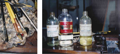 戸嶋靖昌の制作道具その頃は、医者から早くて三ヶ月、どんなに長くても六ヶ月以内に必ず死ぬと言われていた。末期ガンなので、手当ても手段も一切残されていない、何も打つ手はないと言われて、死ぬのを待つだけという状況だった。あとは痛みが出た時に、治療していくという。そう言われてから新たに描き出したのが、絶筆になった僕の肖像画で、《魅せられたる魂 -執行草舟の像-》という作品です。これも展覧会に出される作品ですが、これが戸嶋の最後の作品となったわけです。