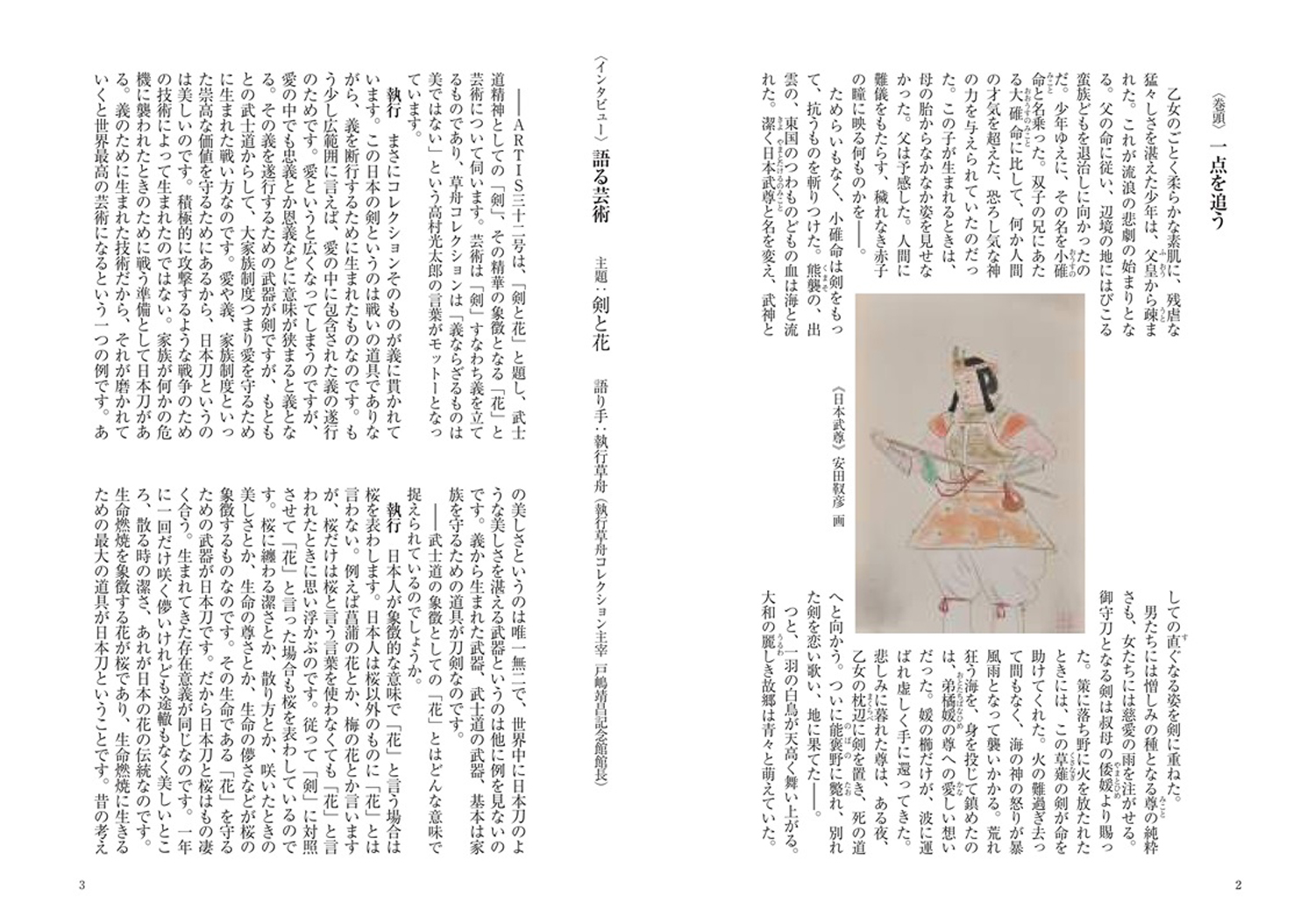 弊館のコレクションを様々な切り口で紹介し、皆さまにご好評いただいている「ARTIS」(ラテン語で芸術の意)の第32号が12月1日に刊行されます。今回、12月10日から開催される「剣と花」展(~2025年3月22日)に合わせ、同テーマで、芸術に現われた武士道精神すなわち「剣」、またその精華の象徴としての「花」について思索します。ご好評いただいている館長インタビューでは、日本の「剣」のもつ美しさの淵源、また、「花」の象徴する生命燃焼について語ります。